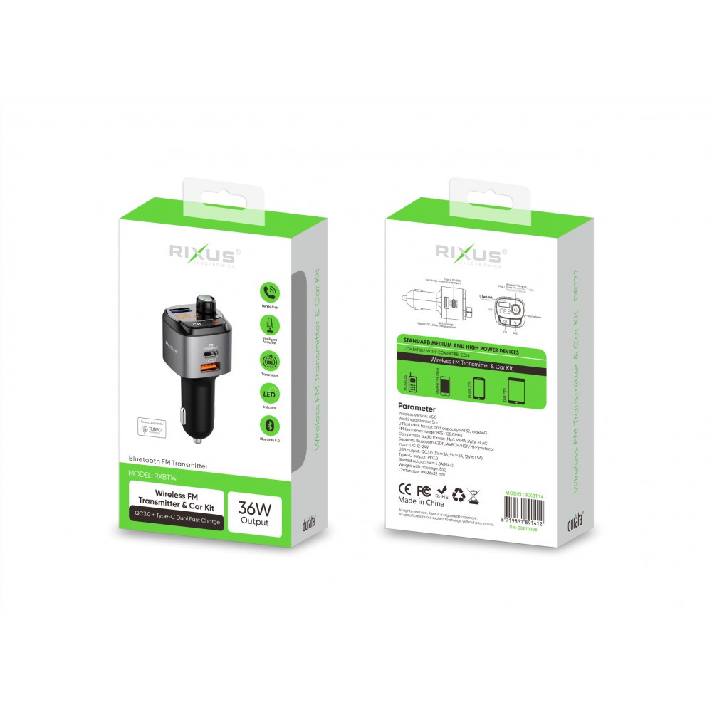 Originele Rixus Bluetooth FM Transmitter met USB-C PD
